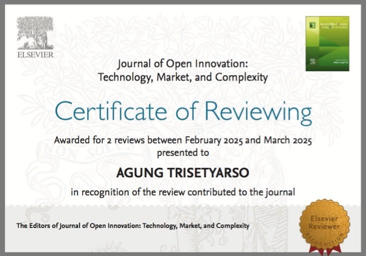 Elsevier Certificate of Reviewer on Journal of Open Innovation: Technology, Market, and Complexity (Switzerland, Q1 in three categories)
