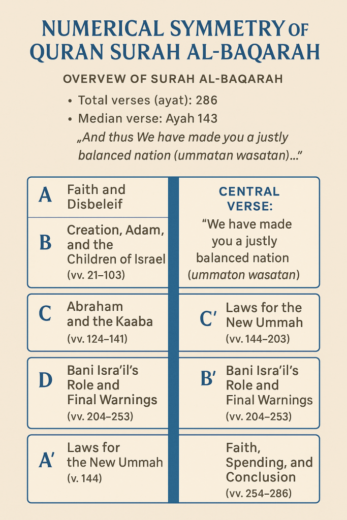 Surah Al-Baqarah (QS 2), the longest chapter in the Qur’an, is a fascinating subject of study when it comes to numerical symmetry, structure, and chiastic patterns (inverted symmetry: A-B-C-B’-A’). Below is a detailed exploration of its symmetry: